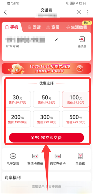 3、选择充值金额,确认号码后点击立即缴费完成操作。