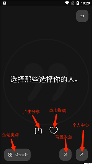 2、主页面会显示金句精选和分类内容,同时展示一些快捷操作按钮,可以查看和管理已有的金句;
