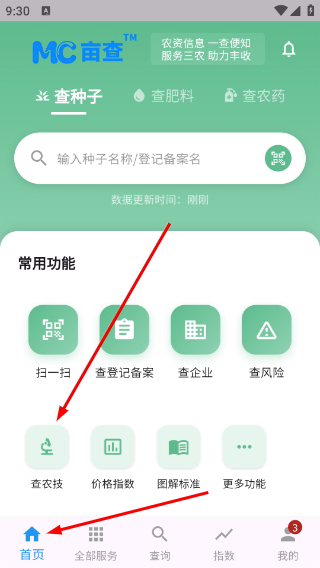 1、打开MC亩查APP,在首页的常用功能区域找到并点击查农技功能入口,进入对应操作页面。