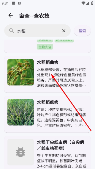 3、搜索水稻后在展示的结果列表,找到并点击水稻稻曲病的对应条目进入详情页面。