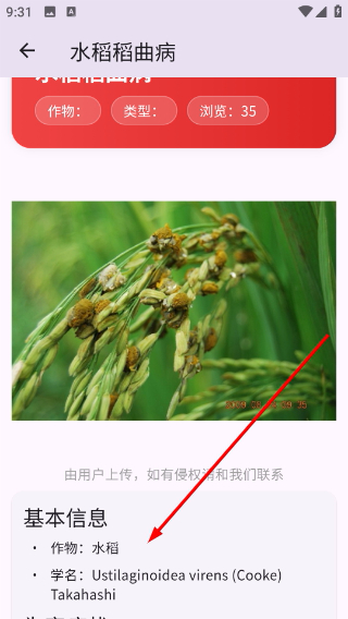 4、进入水稻稻曲病详情页后,可查看该病害的基本信息症状等完整的农技相关内容。