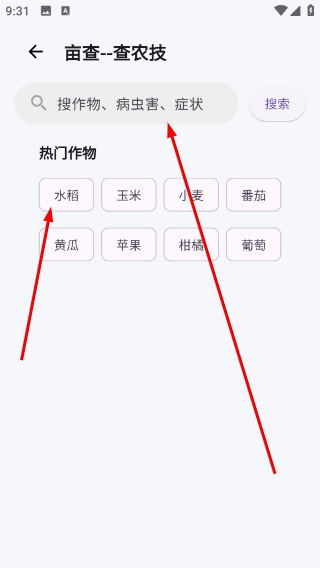 2、进入亩查查农技页面后,可直接点击水稻等热门作物选项,也能在搜索框输入目标内容。