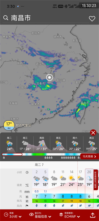 3、进入目标城市后可以查看每三小时或每日的天气变化,降水、风速和阵风情况都能掌握,还能看未来十五天预报和周边雷达情况。