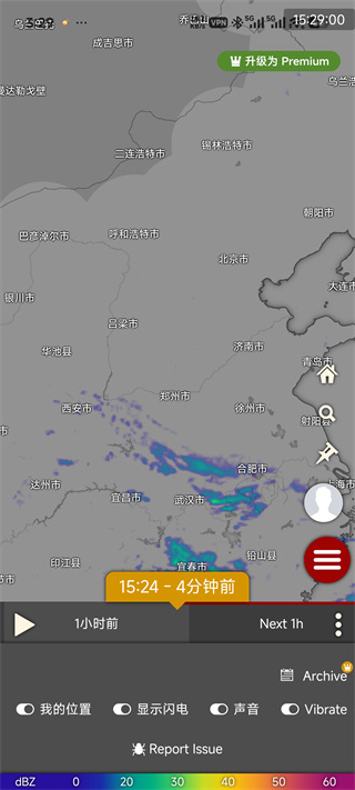 1、切换到气象雷达界面,就能看到全国实时降水回波,用底部时间轴回溯或预测一小时内的雨雷情况,还能开启闪电和声音提醒;